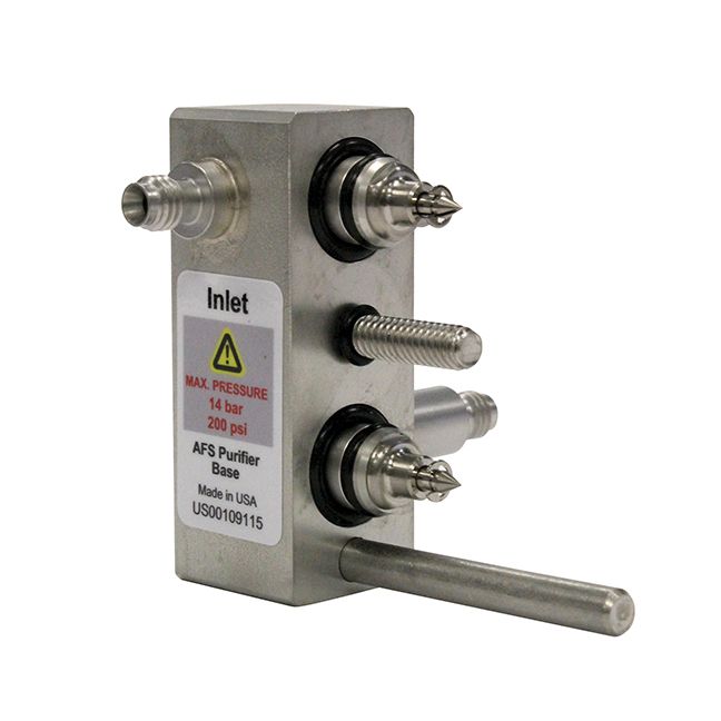 A high-capacity, Non-Hazardous, gas purifying system designed to reduce contaminants in gases commonly used in laboratory applications to low-ppb levels, available in two models. The PolyGas AFS Purifier I removes oxygen, moisture and hydrocarbons, (greater than C4) from inert gases and hydrogen. It contains high-sensitivity oxygen and moisture indicator. When cartridge is depleted the oxygen indicator changes from GREEN to GREY. The Moisture indicator changes from BLUE to BROWN. Both AFS Purifier I and AFS Purifier II have a very high capacity and can be expected to supply four GC's for at least one year when used with 99.995% pure gas supplies (provided reasonable care is taken during tank changes). The Advanced Filter System Complete Kit includes the AFS Cartridge, Manifold, and the wall and bench mounting brackets.